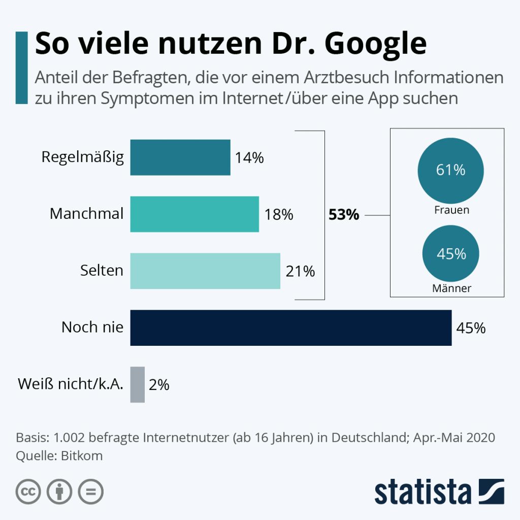 Laut einer Befragung des Branchenverbandes der deutschen Informations- und Telekommunikationsbranche (kurz Bitkom) aus dem Jahr 2020 informieren sich mehr als die Hälfte der Internetnutzer:innen in Deutschland online über ihre Krankheitssymptome. Interessant ist dabei, dass Frauen offenbar häufiger Dr. Google nutzen, als dies Männer tun. Ärzte in Praxen oder Krankenhäuser sind kaum überrascht, wenn Patienten bereits informiert bei ihnen aufschlagen. Wie gut die eigene Recherche jedoch zu einem sinnvollen Verständnis geführt hat, steht auf einem anderen Blatt. Und genau an dieser Stelle kommt Dr. Google sowie jede vergleichbare Suchmaschine im Web an ihre Grenzen.